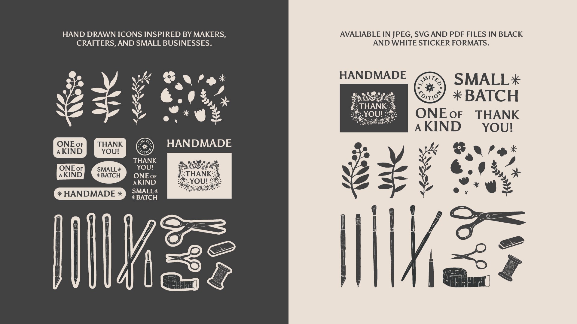 Two thank you cards, one white with black illustrations and one black with white illustrations sit on top of one another. Both cards have the same illustration which is a hand drawn text saying thank you with a floral/folk style illustration around it.